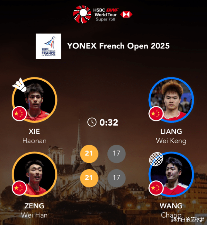 北京时间10月22日,2025年法国羽毛球公开赛男双1/16决赛,国羽内战,世界排名第六的梁伟铿王昶0-2不敌世界排名27的谢浩南/曾维瀚,两局比分17-21、17-21。