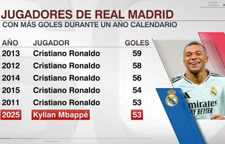 截止目前,姆巴佩2025年度已经累计为皇家马德里队打入了53粒进球,成为皇马队史第二位达成53粒进球的球员。而排在姆巴佩前面的是C罗,他在2011-2015年间,每年的进球数都至少是53球,其中最多的一年是在2013年,彼时C罗为球队轰入了59球。