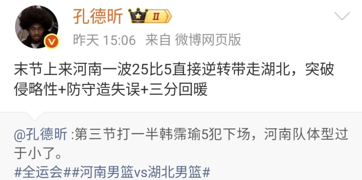 《体坛周报》记者孔德昕发博表示:“未节上来,河南一波25比5直接逆转带走湖北,突破的侵略性+防守造失误+三分回暖。”真的让湖北全运男篮无从应对。