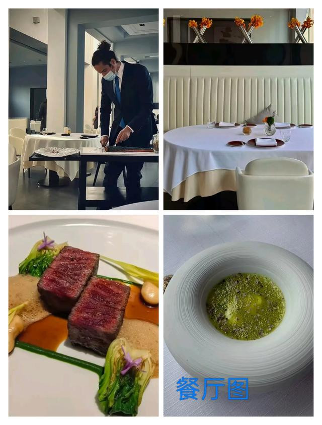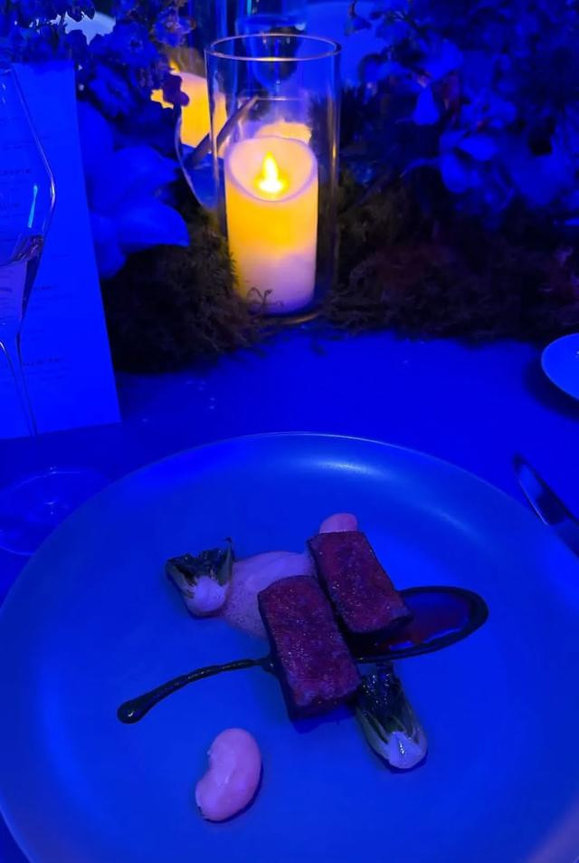 还有现场的美食,一个很大的盘子,摆盘很精美,中间只有两块小小的牛排,看菜品的考究程度就知道档次是顶级的。