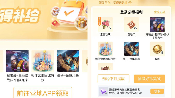 比如近期王者营地就出了一个活动,只要登录游戏,就能够领取奖励。