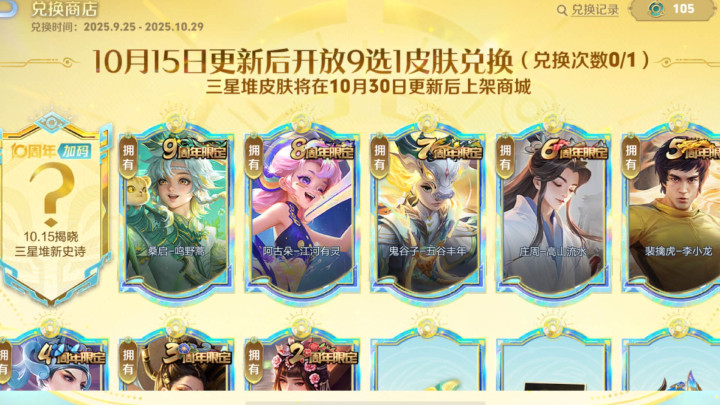 总共有9款周年庆皮肤可以选择,如下图所示,其中有八款,是往年的周年庆皮肤,还有一款则是三星堆主题史诗皮肤,也是今年的周年庆皮肤之一。